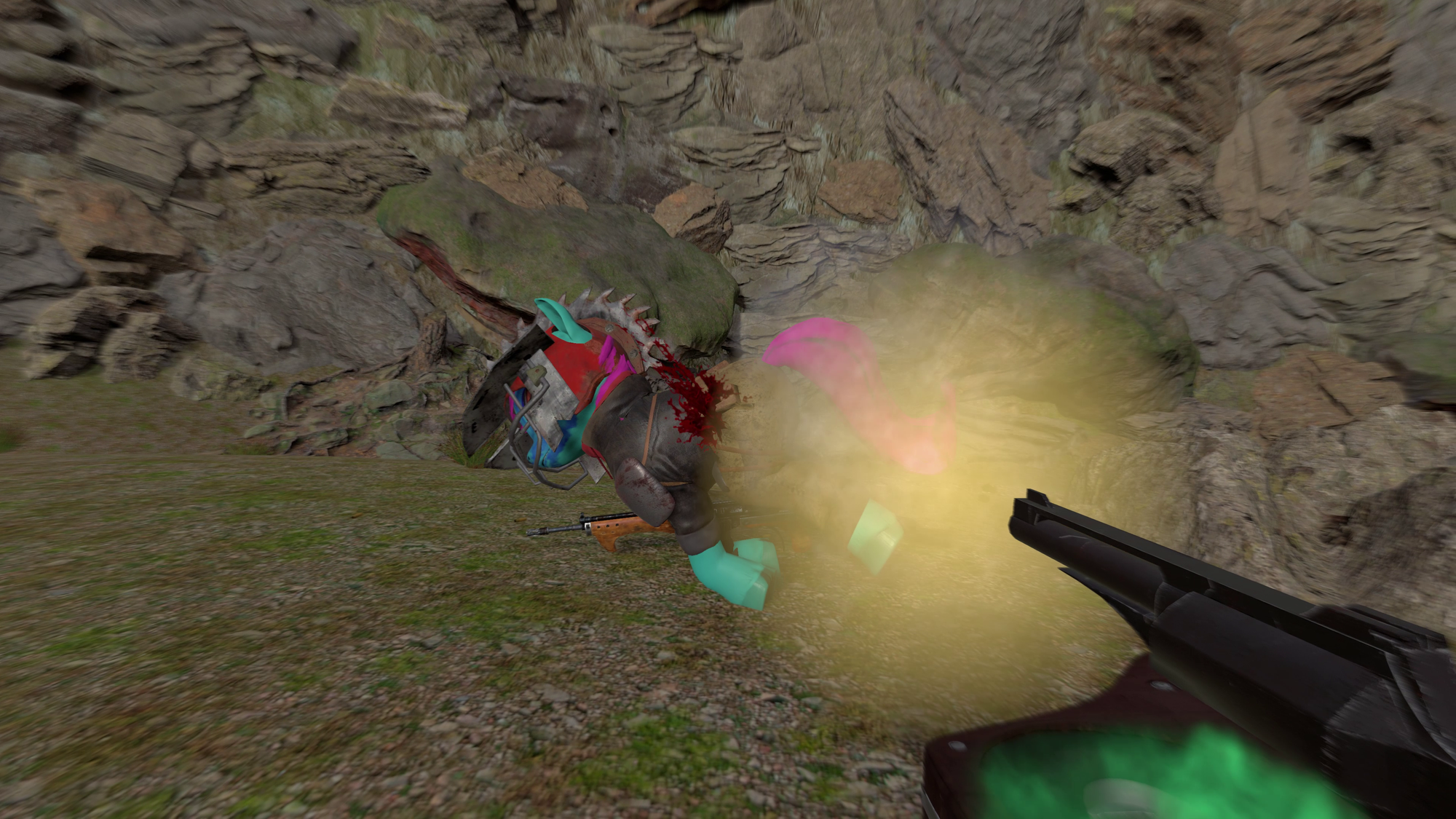 - Blood: We've introduced our first implementation of blood. Pony NPC's will have blood spurts when hit or shot, leaving splatters of blood onto the ground. When they die, even a blood pool is formed. We plan to expand this to other enemy types, as well as additional improvements in the future.